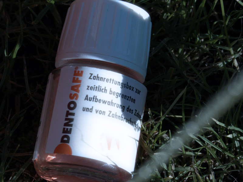 Abgebrochenenes Stück suchen, nicht reinigen und an der Wurzel anfassen. Zum Transport Rettungsbox benutzen (gibt es in der Apotheke). Wenn nicht vorhanden, Zahn in kalte Milch einlegen. Mund schließen, Zähne sanft zusammenbeißen.